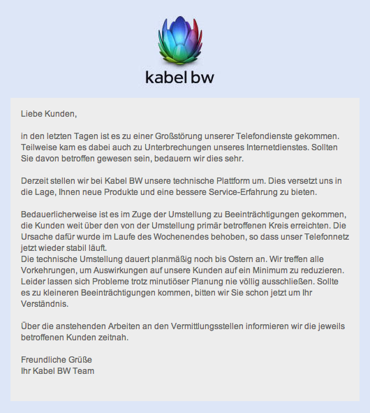Ach KabelBW! Das ist doch kein Problem! Wir sind doch Freunde und nicht etwa Kunden. Eine Entschädigung ist da gar nicht nötig. Aber lieb, d